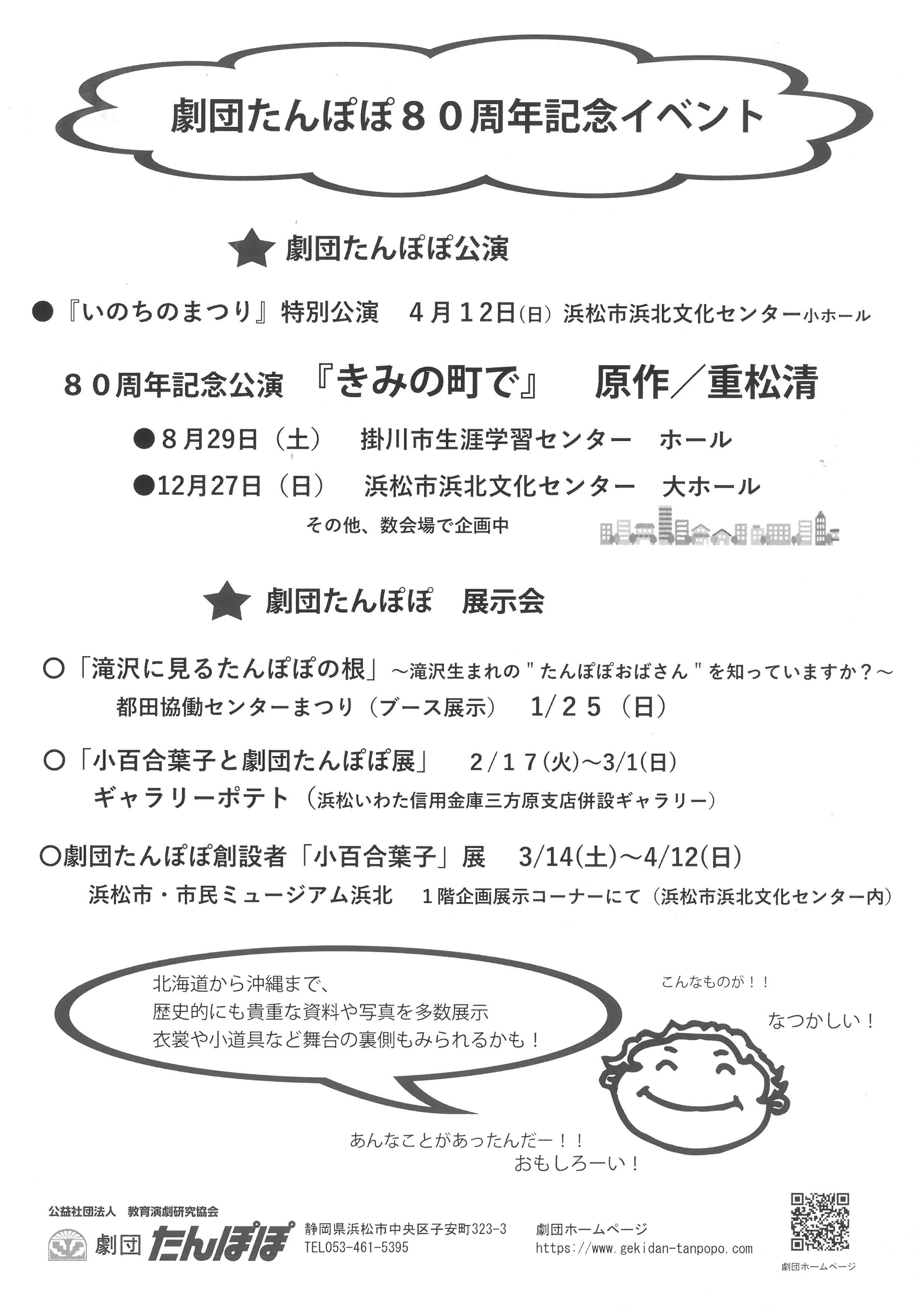 ちらし表画像 小百合葉子と劇団たんぽぽ展 ~「子どもたちに夢を!」小百合葉子と劇団たんぽぽの80年~ 日程会場 2026年2月17日(火)~3月1日(日)ギャラリーポテト (浜松いわた信用金庫三方原支店併設ギャラリー)(浜松市中央区三方原町968-1) 時間 平日9:00~17:00 土・日・祝9:00~16:00 料金 入場無料 ミニイベント 2月28日(土)13:30~(約20分)・紙芝居「ももたろう」・クイズラリー(第一弾!) ※申込み不要